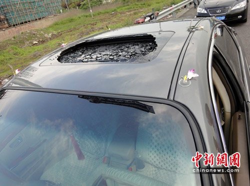 轿车天窗被冰雹砸坏